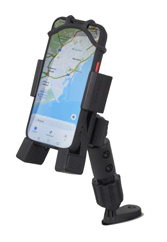 Стойка за смартфон, съвместим с всички мотоциклети. Той позволява бързо регулиране на телефона, като е напълно достъпен за използване, независимо от неговия размер (от 135×65 мм до 180×90 мм).