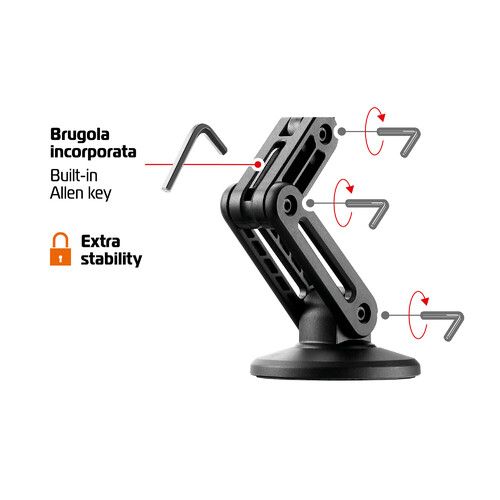 Регулируемото на 360° рамо, което може да се разтегне до максимум 13 см, разполага с 3 шарнира, които могат да се заключват с шестостенен ключ за прецизно и персонализирано регулиране. Когато не се използва, рамото се сгъва, за да спести място. Основата с 3M VHB лепило позволява бърз и сигурен монтаж. Съвместимо с Magcase Optiline, Apple устройства с технология MagSafe и Android смартфони чрез поставяне на универсалния метален диск от външната страна на калъфа.