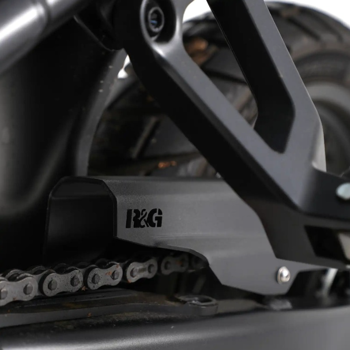 Предпазителите за верига R&G осигуряват пълно покритие на веригата от близо до точката на въртене на задното колело до задния зъбен колело. Те гарантират пълна защита на веригата, както и предотвратяват разпръскването на материал от веригата върху гумите. Изработени от алуминий (в повечето случаи), предпазителите за верига R&G се монтират лесно, като се използват съществуващите крепежни елементи. Покрити са с матово алуминиево покритие, което осигурява висококачествено, издръжливо покритие, което изглежда фантастично.