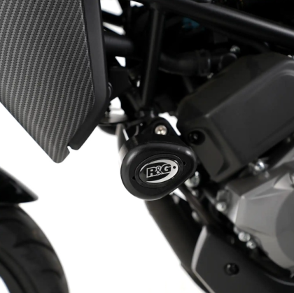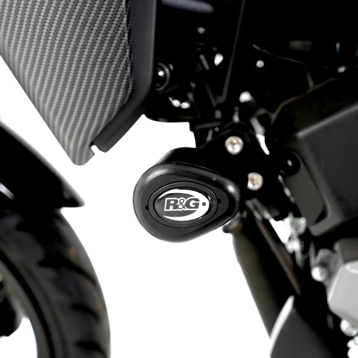 Предпазителите за сблъсък R&G Racing Aero са оборудвани със стилните, аеродинамични Aero Bobbins и се предлагат в черно или бяло, в зависимост от модела на мотоциклета.