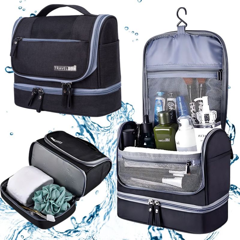 GEANTĂ DE TOALETĂ DE CĂLĂTORIE, CU CÂRLIG, MARE, UNISEX, IMPERMEABILĂ, NEGRĂ