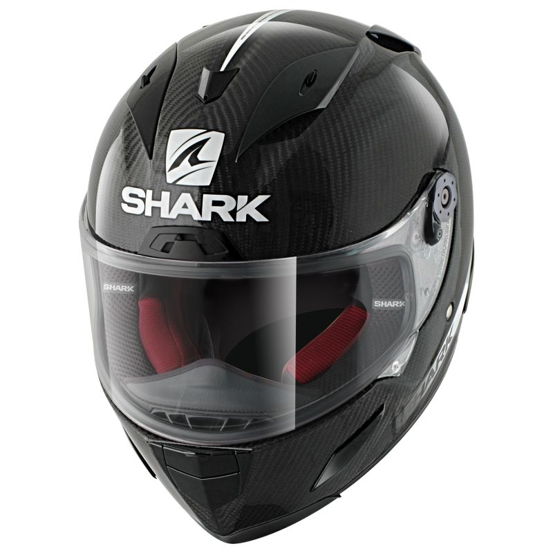 Casca de motocicletă SHARK, din gama de curse „RACE-R PRO Carbon”, prezintă noua structură COVA (Carbon On View & and Aramid), care reduce greutatea, rezistă la uzură și compresie, îmbunătățind în același timp și caracteristicile antideformare. si absorbind socurile.