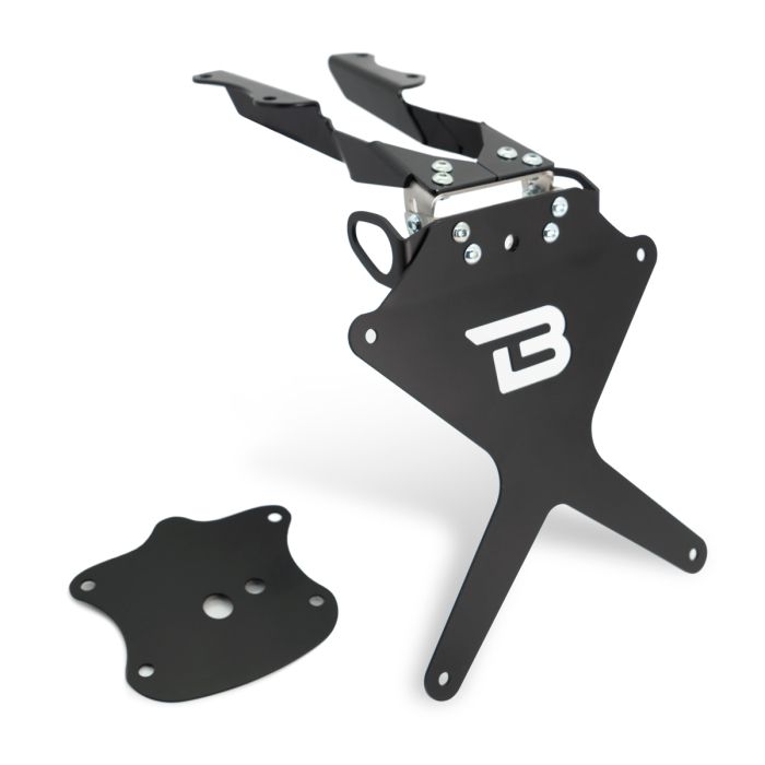 Suportul pentru plăcuța de înmatriculare este fabricat din aluminiu anodizat negru + braț de reglare din fontă. Este specific modelului, iar kitul include un suport de asamblare și șuruburi. Nu sunt necesare modificări la piesele originale în timpul asamblării. Este SPECIFIC PENTRU SEMNALIZATOARELE ORIGINALE. NOTĂ: compatibil numai cu semnalizatoarele LED originale din 2020.